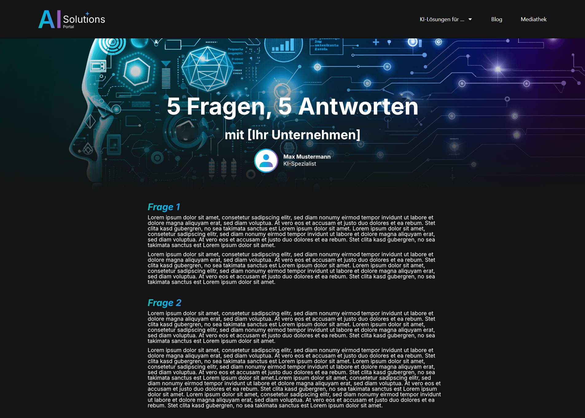 Wir stellen Ihnen 5 gute Fragen, auf die Sie 5 gute Antworten parat haben – und veröffentlichen das Interview auf dem AI Solutions Portal. Ein authentischer Dialog, der potenziellen Kunden zeigt, warum Sie der richtige Ansprechpartner sind, wenn es um KI im Mittelstand geht.